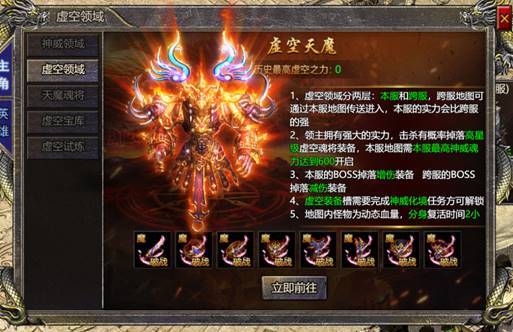 3. 功能说明:虚空领域分为本服和跨服两层,挑战领域怪物有概率掉落虚空魂将装备,领域内pk爆装概率为其他野外地图的三分之一
