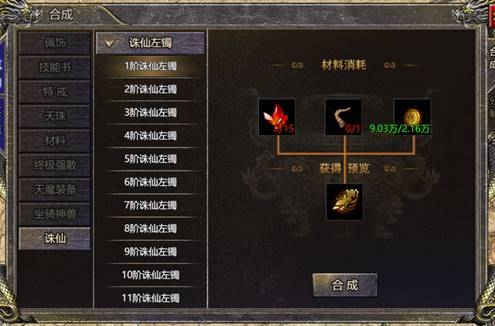 3. 功能说明:消耗仙力结晶,合成强力诛仙装备,诛仙装备会给基础战装带来强力属性增幅,仙力结晶可在灵符商城购买获得。