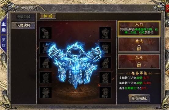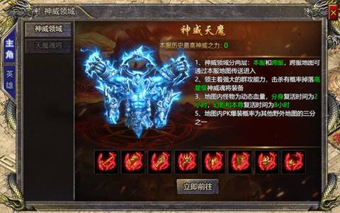 3. 功能说明:神威领域分为本服和跨服两层,挑战领域怪物有概率掉落神威魂将装备,领域内pk爆装概率为其他野外地图的三分之一