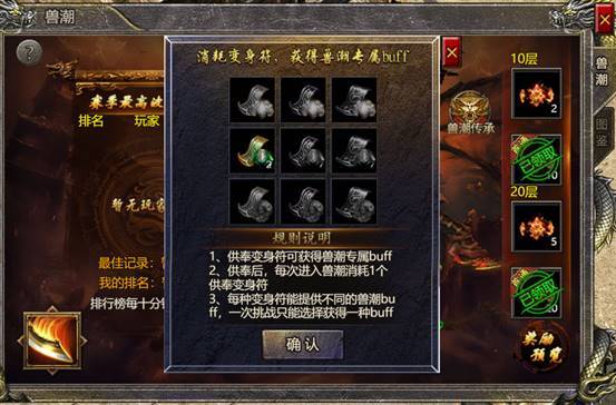 3. 功能说明:玩家可在无尽兽潮挑战前供奉变身符,供奉变身符可获得兽潮专属buff,供奉后,每次进入兽潮消耗1个供奉变身符,每种变身符能提供不同的兽潮buff,一次挑战只能选择获得一种buff。