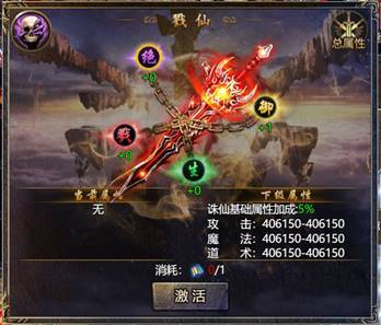 3. 功能说明:玩家可以消耗戮仙剑诀提升戮仙等级,提升戮仙等级可获得大量属性,增幅诛仙基础属性,激活戮仙套装有概率秒杀怪物,戮仙剑诀可在戮仙试炼中获取。