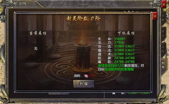 3. 功能说明:消耗封灵息石,获得强大属性提升,激活封灵后,连续命中目标12次将使对方进入易损状态,攻击易损状态的目标造成的伤害会提升。挑战跨服福利广场boss可获得封灵息石。